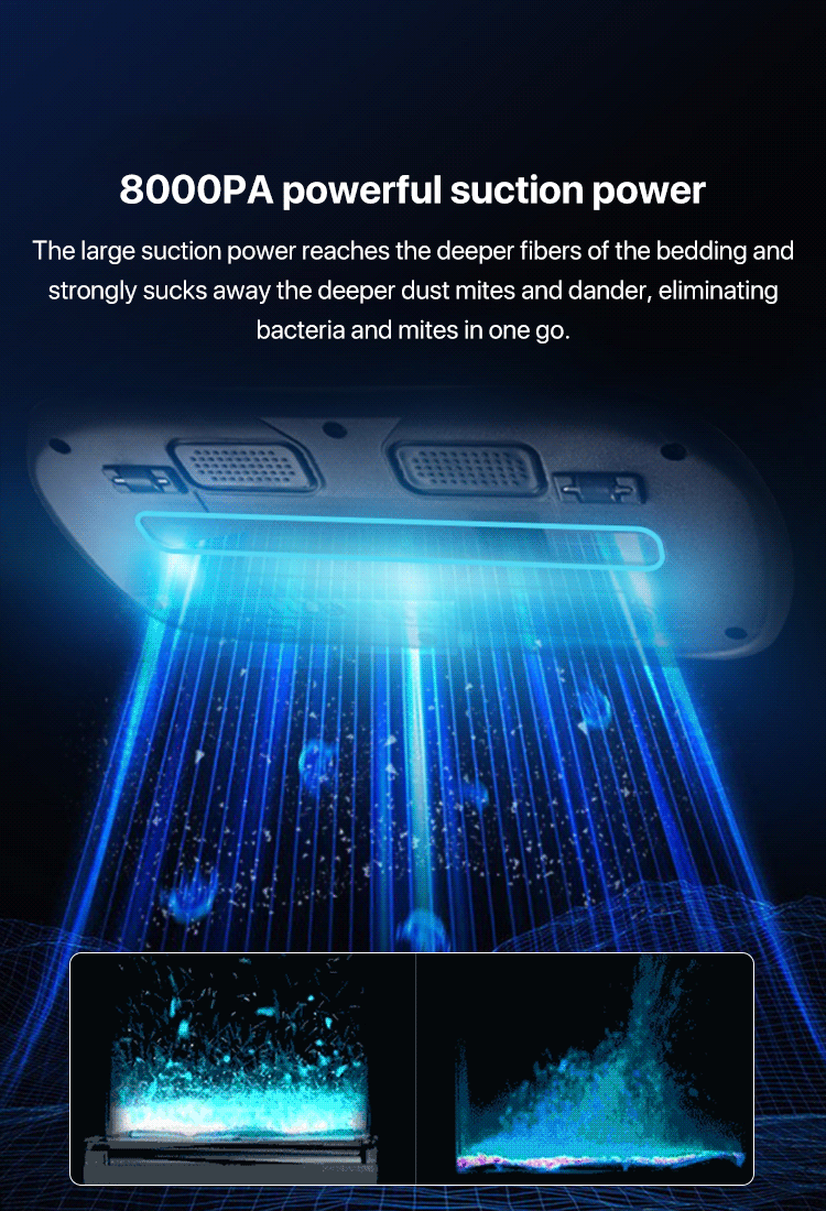 The channel design ensures smooth airflow and strong suction pressure. This bed vacuum cleaner effectively removes more dust from the fabric surface. The full-seal technology and HEPA filter trap the dust inside the vacuum cleaner.